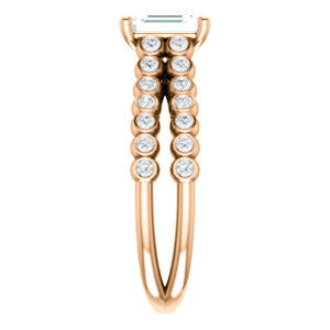 Note: For a slightly different take on this ring style, try The Roxana's sister ring style with bezel-set center stone with simpler cathedral setting, and fewer bezel-set accent stones along a thinner and straighter split band.