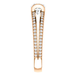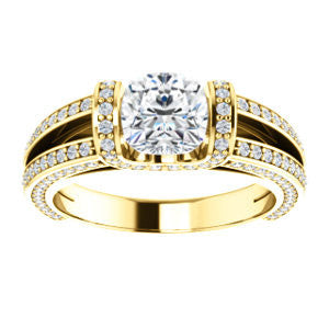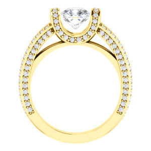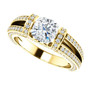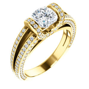 Frankly, dear, you may not give a damn what people think. And if that’s the case, you’ll be attracted to jewelry that portrays how very aloof you are from the fray. Featuring a stunning split-band ring shank inlaid with brilliant pavé-style small CZ stones cascading down from a Cushion Cut cubic zirconia center stone setting in any of your choice of sizes from 0.65 to 5.0 carats, this customizable prong-accented bar-basket engagement ring has enough flair for any two fashionistas. And what about that high-set, quasi-imperious, cathedral-center setting with its multitude of prong accents going up and down and around in horseshoe-like swoops? It’s not just playing "hard-to-get" when most men simply can’t measure up.