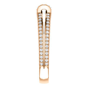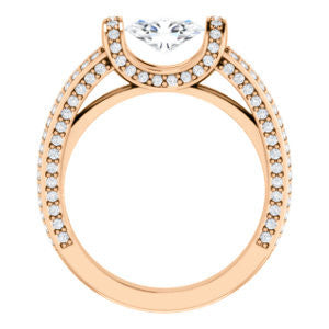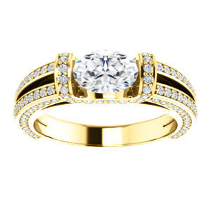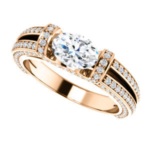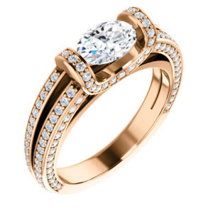 Frankly, dear, you may not give a damn what people think. And if that’s the case, you’ll be attracted to jewelry that portrays how very aloof you are from the fray. Featuring a stunning split-band ring shank inlaid with brilliant pavé-style small CZ stones cascading down from an Oval Cut cubic zirconia center stone setting in any of your choice of sizes from 0.50 to 5.0 carats, this customizable prong-accented bar-basket engagement ring has enough flair for any two fashionistas. And what about that high-set, quasi-imperious, cathedral-center setting with its multitude of prong accents going up and down and around in horseshoe-like swoops? It’s not just playing "hard-to-get" when most men simply can’t measure up.