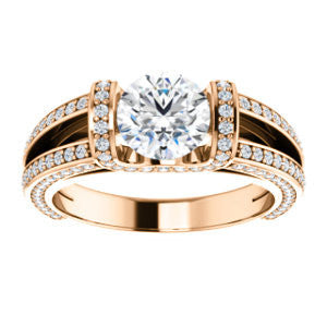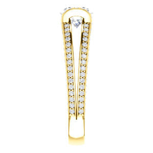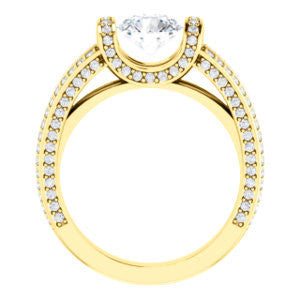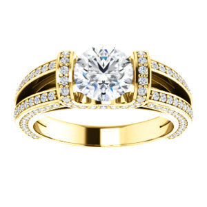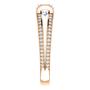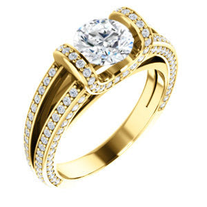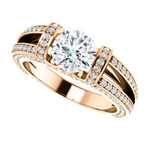 Frankly, dear, you may not give a damn what people think. And if that’s the case, you’ll be attracted to jewelry that portrays how very aloof you are from the fray. Featuring a stunning split-band ring shank inlaid with brilliant pavé-style small CZ stones cascading down from a Round Cut cubic zirconia center stone setting in any of your choice of sizes from 0.50 to 3.50 carats, this customizable prong-accented bar-basket engagement ring has enough flair for any two fashionistas. And what about that high-set, quasi-imperious, cathedral-center setting with its multitude of prong accents going up and down and around in horseshoe-like swoops? It’s not just playing "hard-to-get" when most men simply can’t measure up.