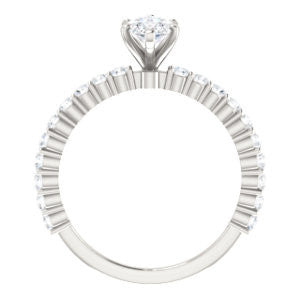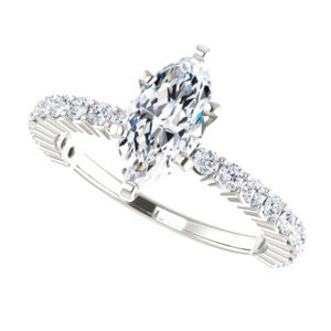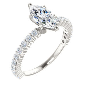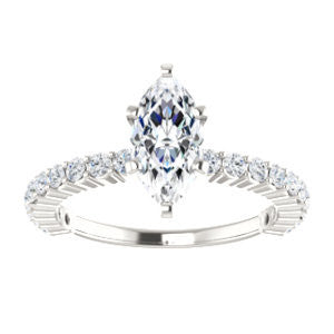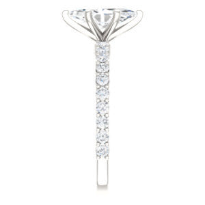 We'd be honored if you trusted us to help with the choice of your engagement ring gift for her. What about The Thea ring style with thin pavé band featuring twenty (20)* small, round-cut, 1.80 mm* accent stones going down more than three-fourths of the stackable band? Available in the precious metal of your choice, this 8-prong-set engagement ring is also customizable with ten (10) different center stone shapes: Asscher Cut, Cushion Cut, Emerald Cut, Heart Cut, Marquise Cut, Oval Cut, Pear Cut, Princess Cut, Radiant Cut, or Round Cut. With the Marquise Cut version as pictured and priced here on this product webpage, you can further customize the center stone to be your preference of between 0.20 and 2.0 carats.