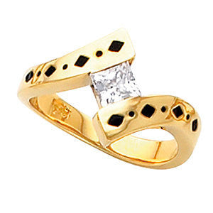 Fierce but classic, this rich ebony-imbued high-quality engagement ring is highly refined and absolutely glamorous. The magnificent ring is intricately set with your choice of a 0.50 or 1.00 carat 5A diamond-quality Cubic Zirconia centerstone of either asscher or princess cut (your choice).