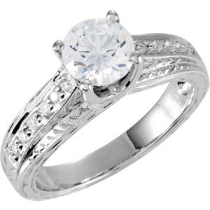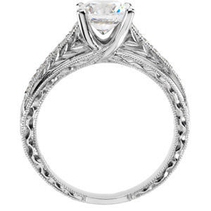 Vintage, polished with a sense of purpose, The Matilda is durable and yours for all time in your choice of pure precious metals featuring twelve (12)* round accent stones along the band with delicate milgrained and filigree edges. Be sure to check the ring's "through-view" side picture for an amazing surprise that a top-view picture just doesn't show. The light dances over this ring's sparkling, solid hand-engraved band and her 1.0 carat round-cut or asscher-cut  5A diamond-quality CZ gemstone that declares her promise of love loudly to the world! Make your lady's heart sing, and show your proud promise of love with this stylish gift.