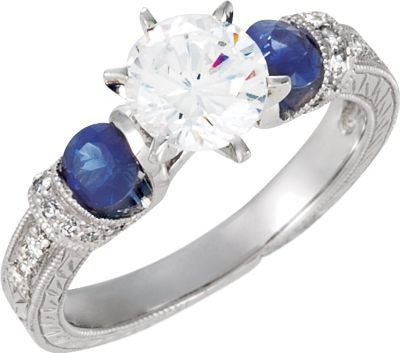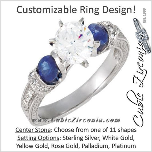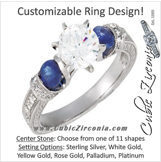 Cubic Zirconia Engagement Ring- The ________ Naming Rights 69-825 (Customizable Vintage with Engraved Band and Blue Sapphire Accents)