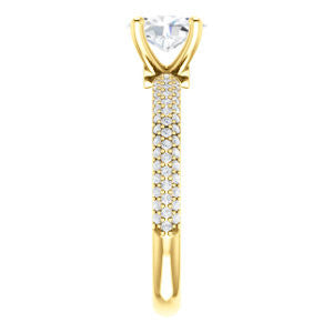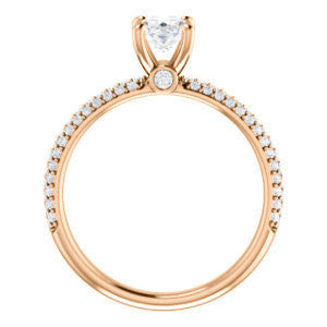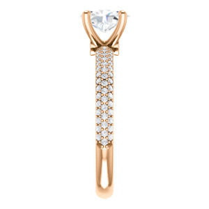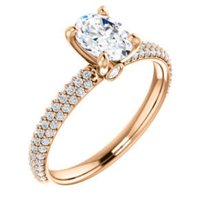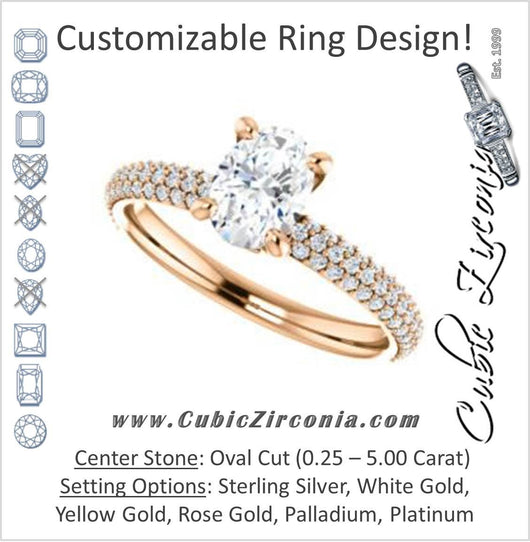 The Merari engagement ring is customizable with a brilliant diamond-quality Cubic Zirconia center stone in your choice of 7 different shapes. As pictured and priced on this product webpage offered with Oval Cut center stone sized from 0.25 to 5.0 Carats, you can also click the "customize" link to see or purchase The Merari with other stone shaped options. Whichever center stone you choose will dazzle atop a fabulous band set with a triple row of smaller cubic zirconia accent stones cascading in a luminous pavé band down either side of the shank of this very stylish engagement ring.