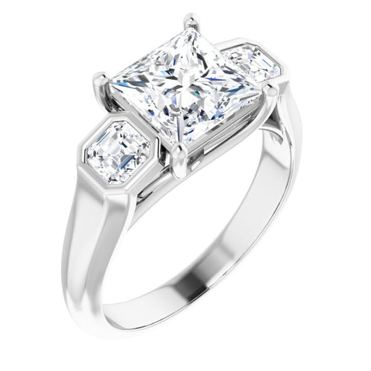10K White Gold Customizable 3-stone Cathedral Princess/Square Cut Design with Twin Asscher Cut Side Stones