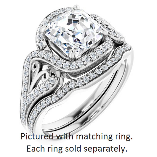 Engagement rings like this bypass-halo-accented 0.65-carat-to-2.50-carat-centered Asscher Cut ring style provide jobs to people to make, package, and ship happiness-in-a-box to our customers. And each ring style all started with the idea. Isn't it incredibly eye-catching what you can create with precious metal when you let your imagination run wild like our talented jewelry designers do when we creep into their bedrooms late at night and whisper "You are a creative genius!" 999 times into their sleeping ear? Details matter. And The Alexis Rose has plenty of those delicious details that lift the ordinary to the extraordinary. Some might call the delicate filigree inlay of metal curlicues in each teardrop-shaped negative space on either side of the center setting a "fleur-de-lis"-inspired design, and that would be fine with us. Further details she'll love include a wide, tapered band flowing organically from 5.16 mm tapered to 1.8 mm* in width. The split-shared prong band features dozens of round-cut accent stones, which curve up and into that bypass-halo style with dozens more accent stones surrounding your cathedral-raised center stone. Can you tell that this ring was designed by someone who really loves women? Genius recognizes genius.
