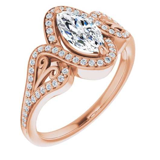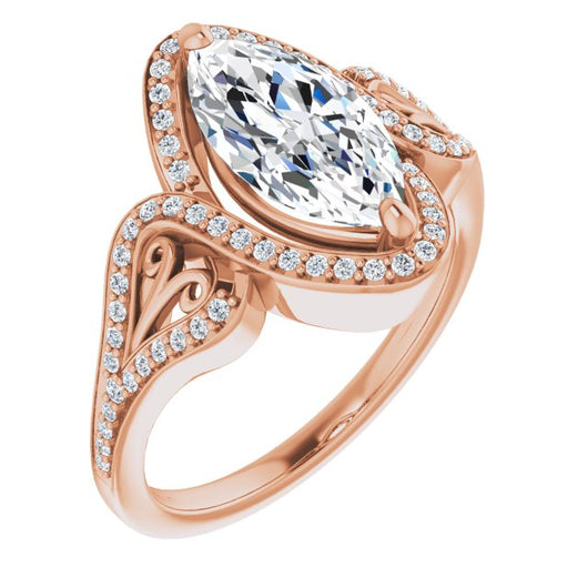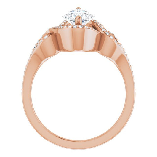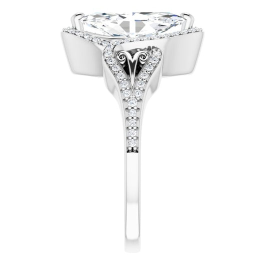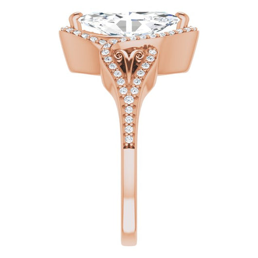 * Your ring’s total carat weight (TCW), band width, weight in grams, and/or number and size of accent, pavé, or halo stones will vary up or down depending on your choice of customizable center stone shape and size, precious metal type, and finger ring size via the drop-down options provided.