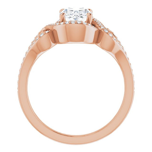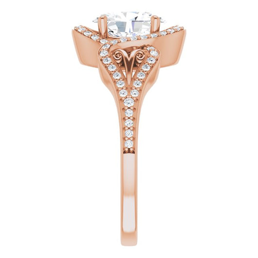 * Your ring’s total carat weight (TCW), band width, weight in grams, and/or number and size of accent, pavé, or halo stones will vary up or down depending on your choice of customizable center stone shape and size, precious metal type, and finger ring size via the drop-down options provided.