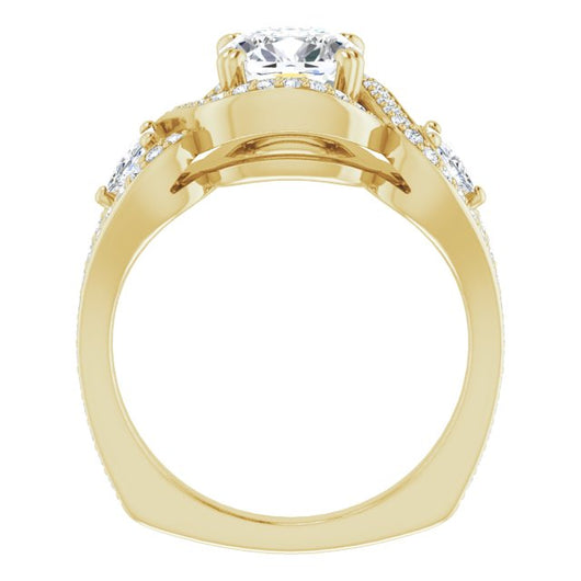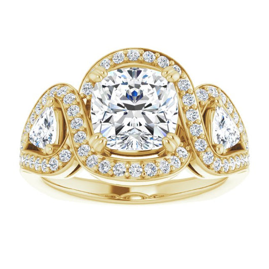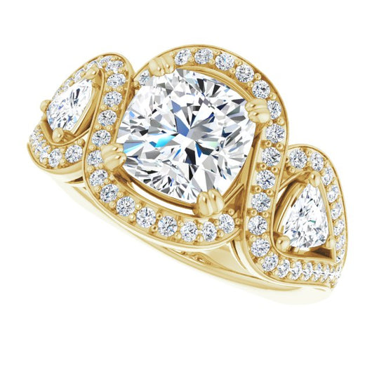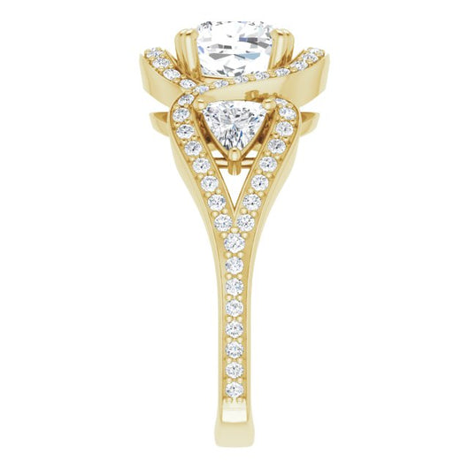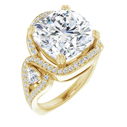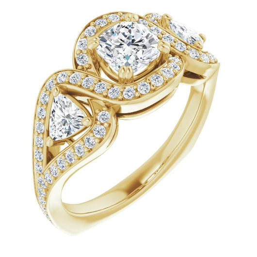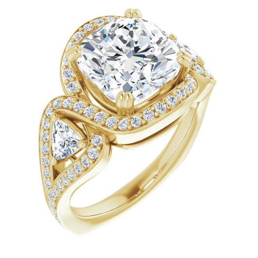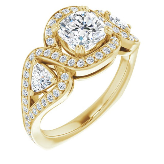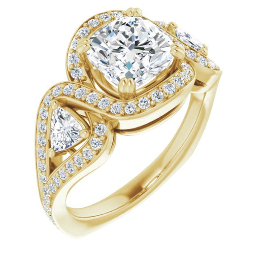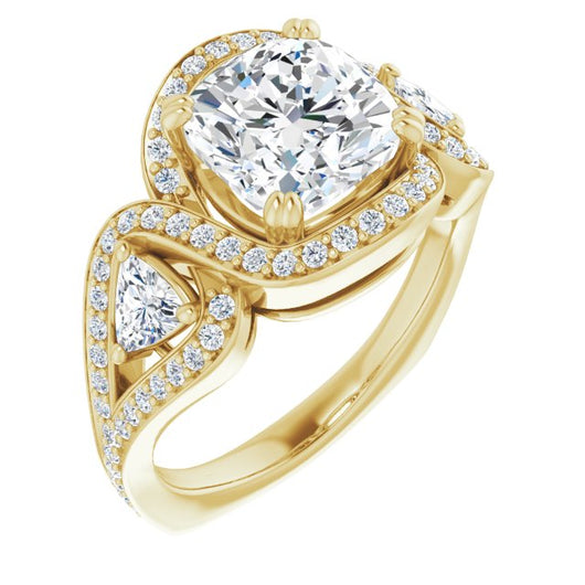 18K Yellow Gold Customizable Cushion Cut Center with Twin Trillion Accents, Twisting Shared Prong Split Band, and Halo