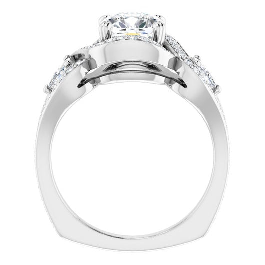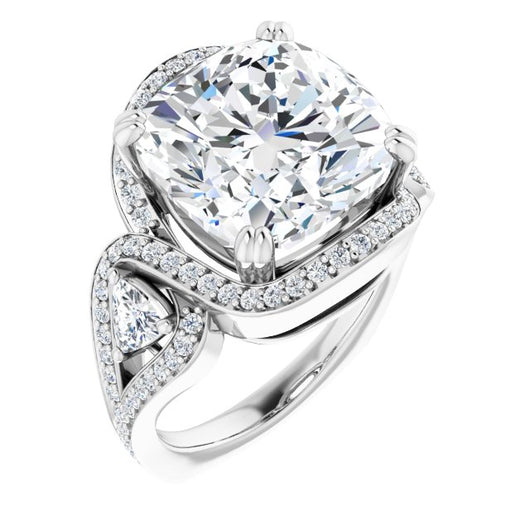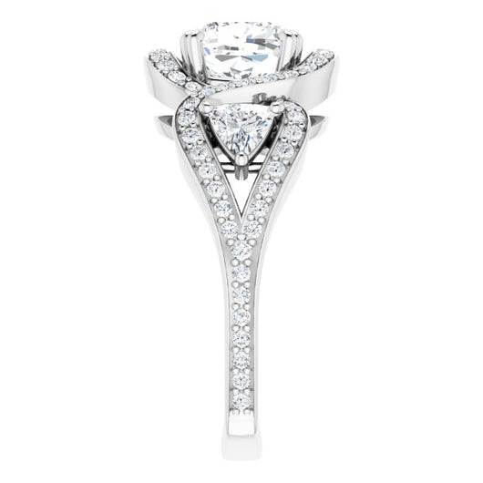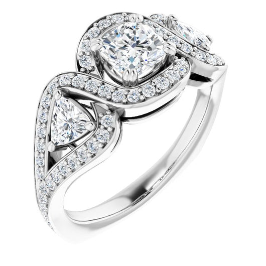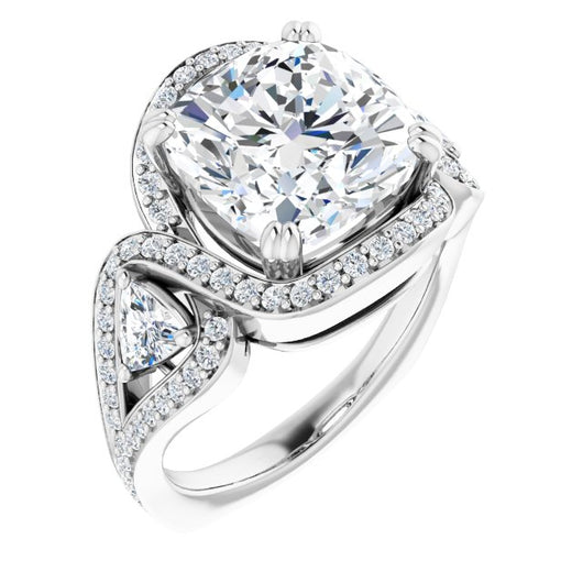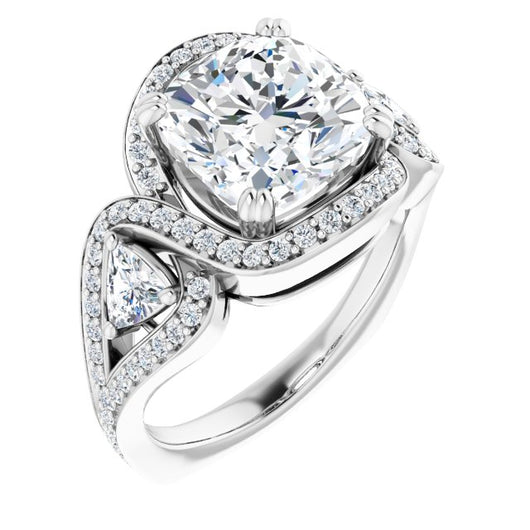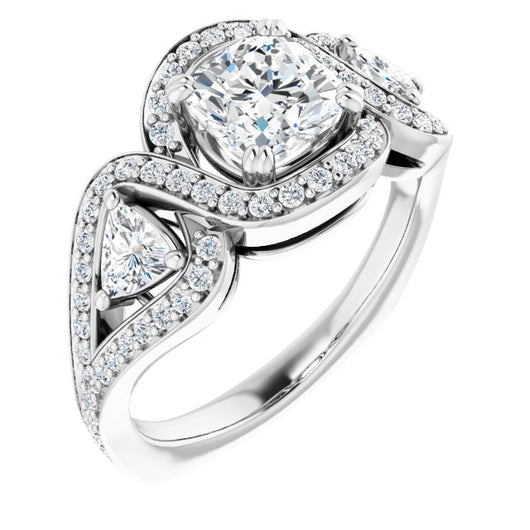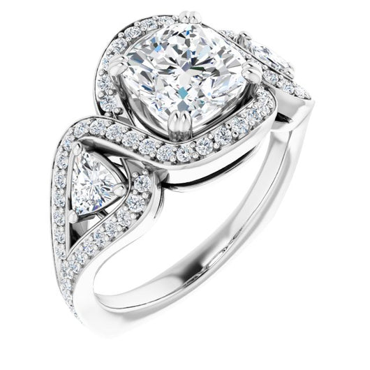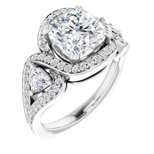 18K White Gold Customizable Cushion Cut Center with Twin Trillion Accents, Twisting Shared Prong Split Band, and Halo