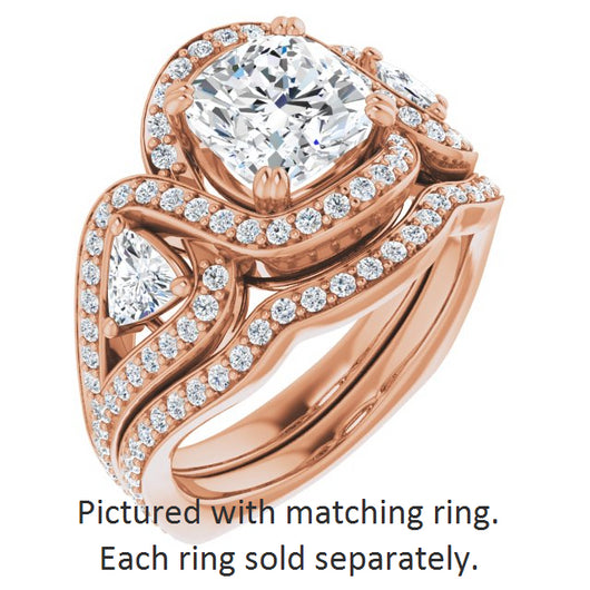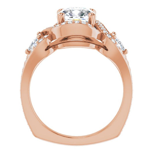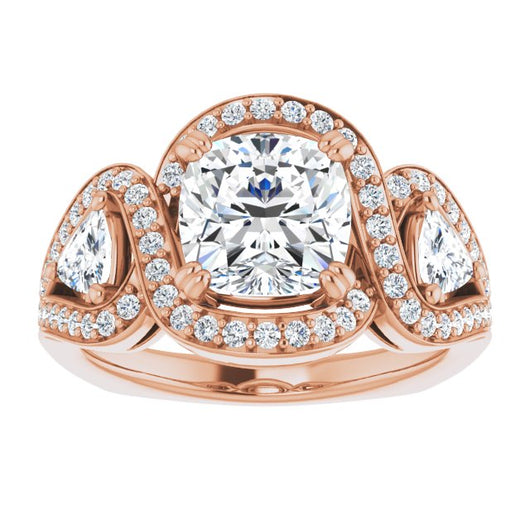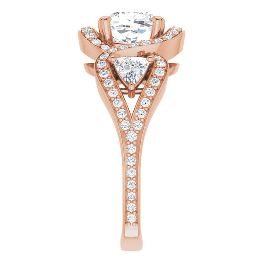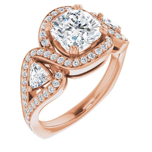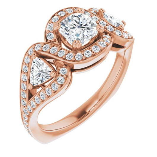 10K Rose Gold Customizable Cushion Cut Center with Twin Trillion Accents, Twisting Shared Prong Split Band, and Halo