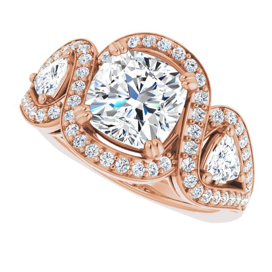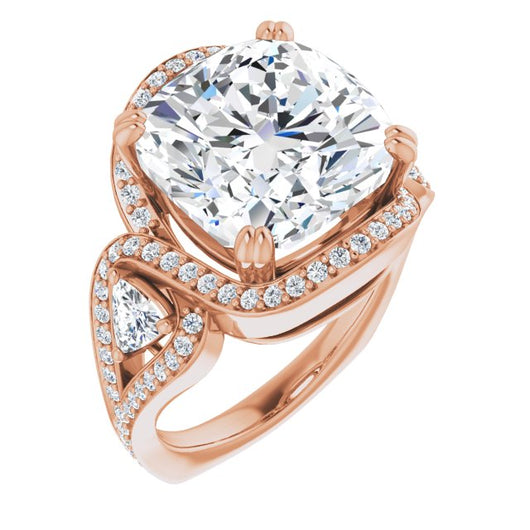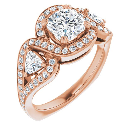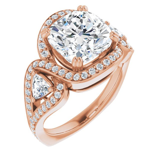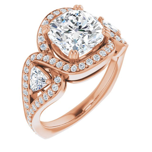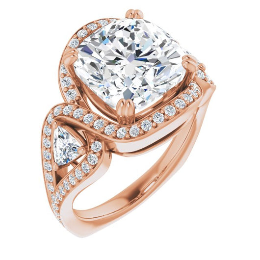 18K Rose Gold Customizable Cushion Cut Center with Twin Trillion Accents, Twisting Shared Prong Split Band, and Halo