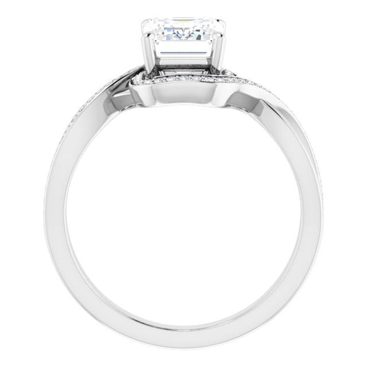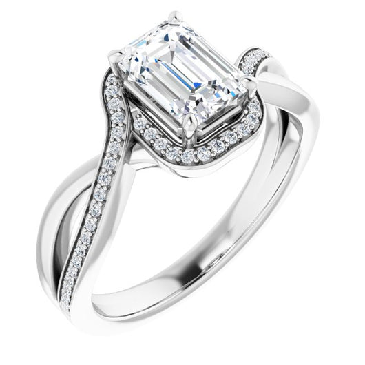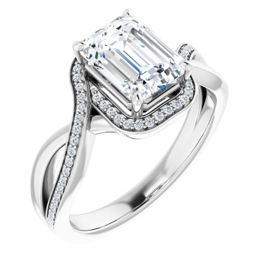 10K White Gold Customizable Bypass-Halo-Accented Emerald/Radiant Cut Center with Twisting Split Shared Prong Band
