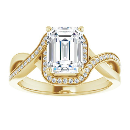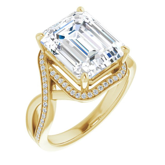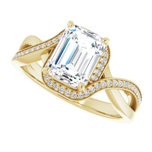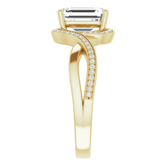 10K Yellow Gold Customizable Bypass-Halo-Accented Emerald/Radiant Cut Center with Twisting Split Shared Prong Band