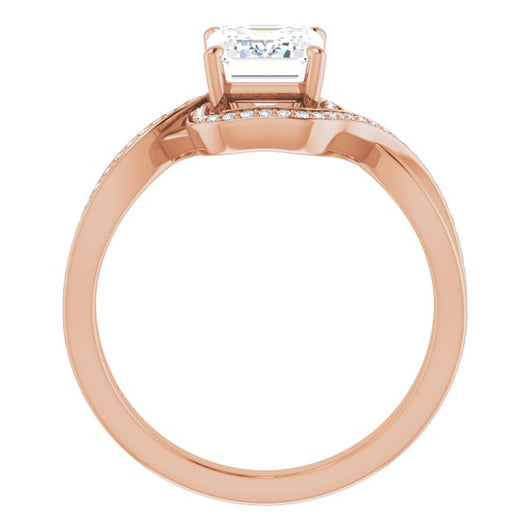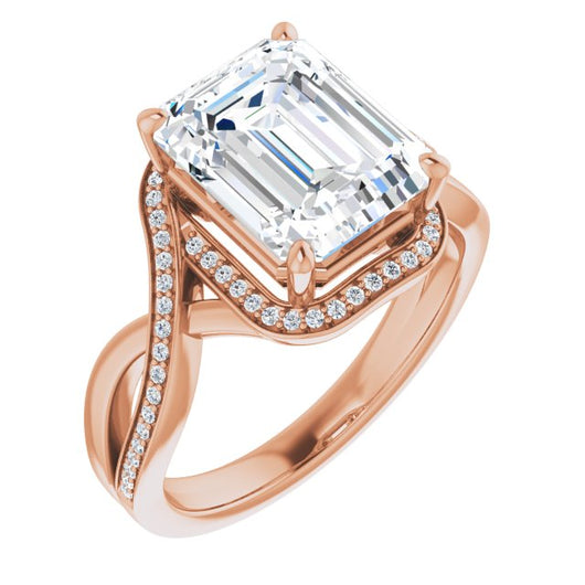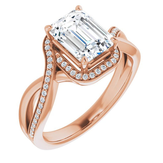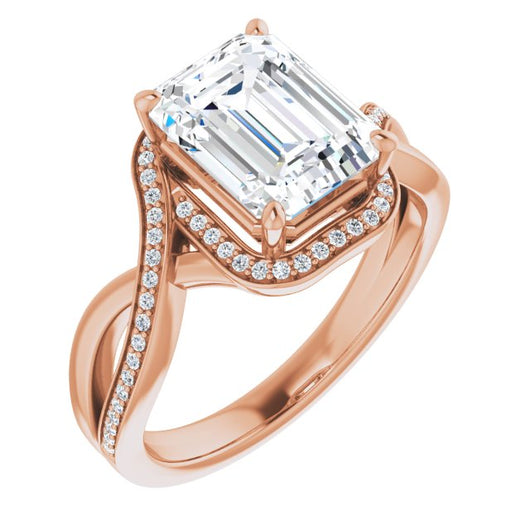 10K Rose Gold Customizable Bypass-Halo-Accented Emerald/Radiant Cut Center with Twisting Split Shared Prong Band