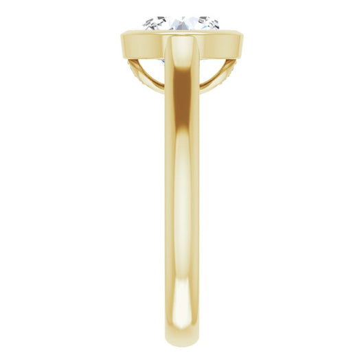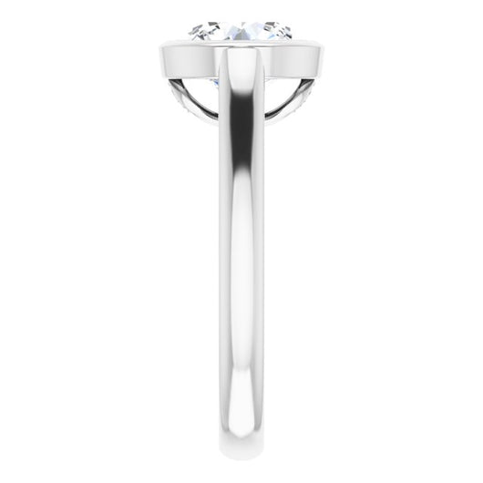 Oops! The lawyers are insistent that we weren't supposed to say that. Back to your original programming! The truth is that when it comes to the science of what's attractive, mystery never goes out of style. The art of subtly concealing just fires the imagination, trumping what's too blatantly revealing. That's why we're pleased to produce this product of our jewelry design team's imagination. The Ann Michelle is a bezel-set Round Cut design with a triple (3) cluster of round-cut accent stones right beneath the center stone setting. You can see these accent stones best from the side view, below the raised cathedral setting holding your center stone sized in your choice of 0.75 to 3.50 carats. The Ann Michelle is available in all 12 precious metal types we most frequently manufacture; shop our smart menu to customize this ring to her/your heart's content.