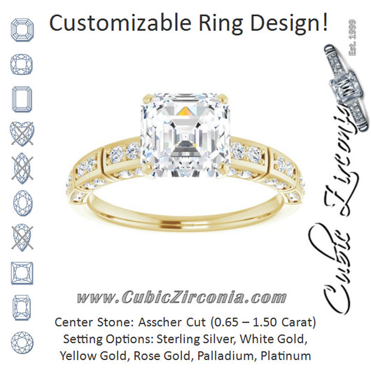 You've come to the right place at CubicZirconia.com to find beautiful and modern Cubic Zirconia engagement ring designs, like The Anna, which can be customized with a 5A diamond-quality Asscher Cut CZ center stone in your choice of weights from 0.65 to 1.50 carats. We're very proud of our jewelry design team's ability to provide a twist on the traditional engagement ring styles that just might express how you feel about her better than something more plain. Do you like this three-sided band with segmented shared prong design? And how about those little segmented jewel-nestlers all around the band filled with thirty-six (36)* precious little round cut accents? Yeah, we thought so.