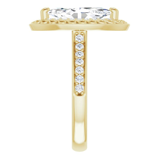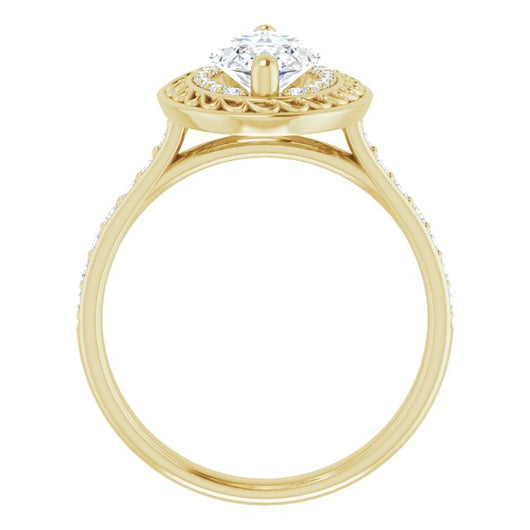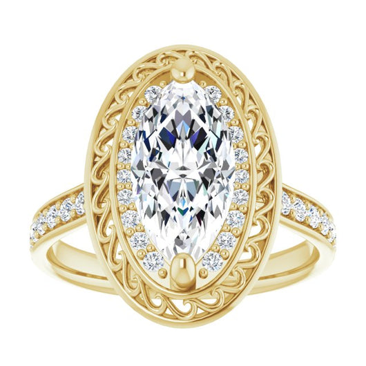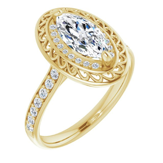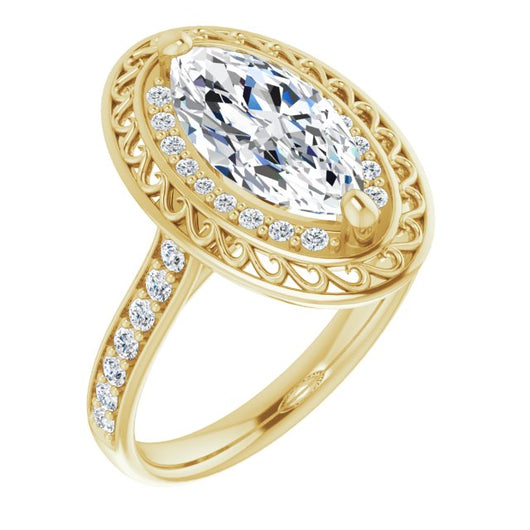 10K Yellow Gold Customizable Cathedral-style Marquise Cut featuring Cluster Accented Filigree Setting & Shared Prong Band