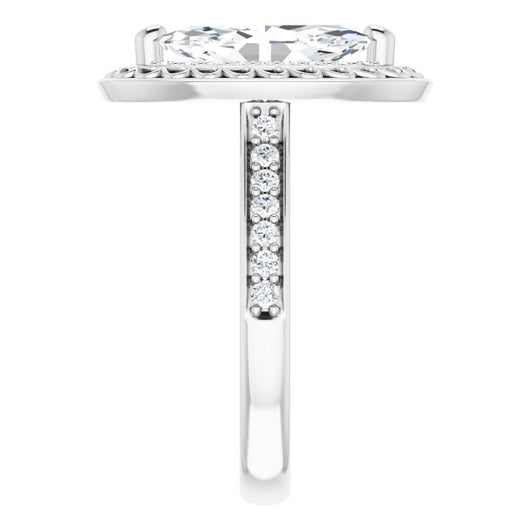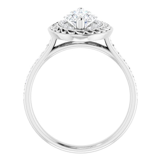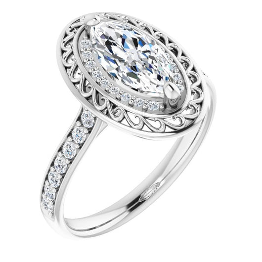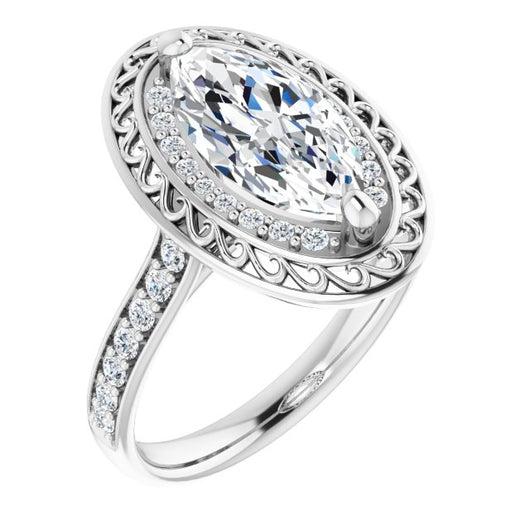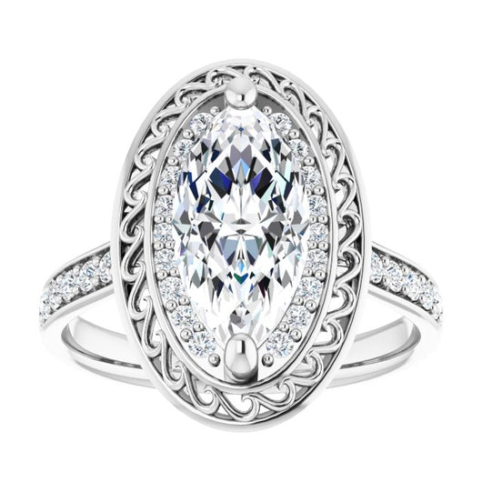 10K White Gold Customizable Cathedral-style Marquise Cut featuring Cluster Accented Filigree Setting & Shared Prong Band