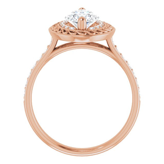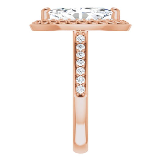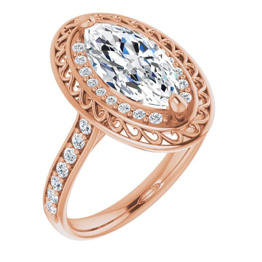 10K Rose Gold Customizable Cathedral-style Marquise Cut featuring Cluster Accented Filigree Setting & Shared Prong Band