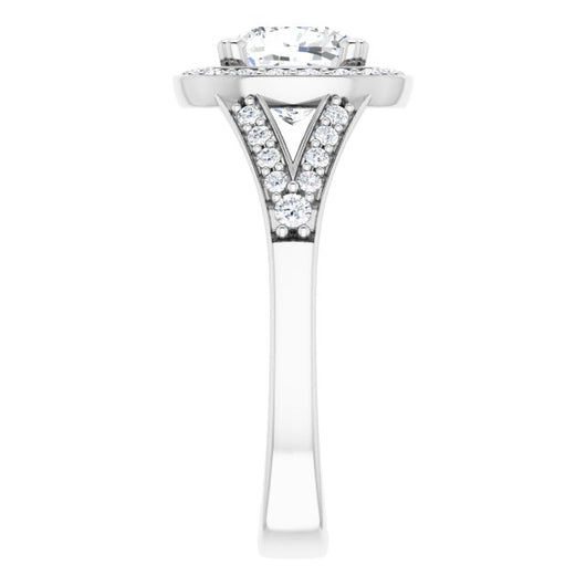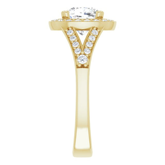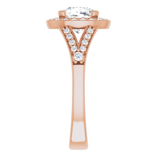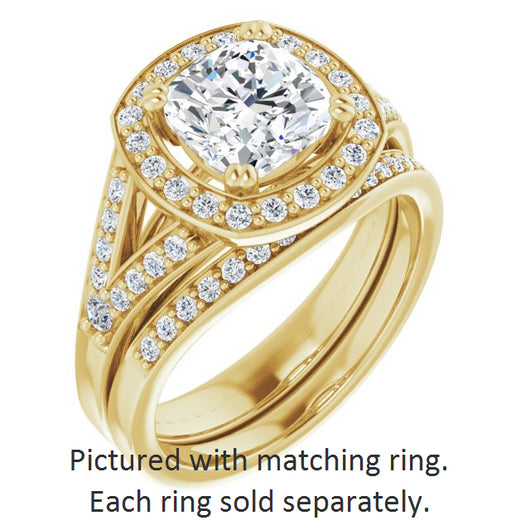 * Your ring’s total carat weight (TCW), band width, weight in grams, and/or number and size of accent, pavé, or halo stones will vary up or down depending on your choice of customizable center stone shape and size, precious metal type, and finger ring size via the drop-down options provided.