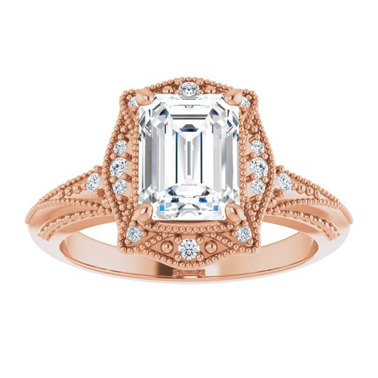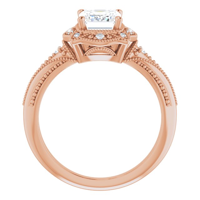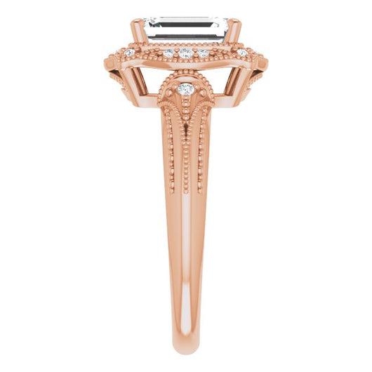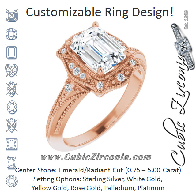 * Your ring’s total carat weight (TCW), band width, weight in grams, and/or number and size of accent, pavé, or halo stones will vary up or down depending on your choice of customizable center stone shape and size, precious metal type, and finger ring size via the drop-down options provided.