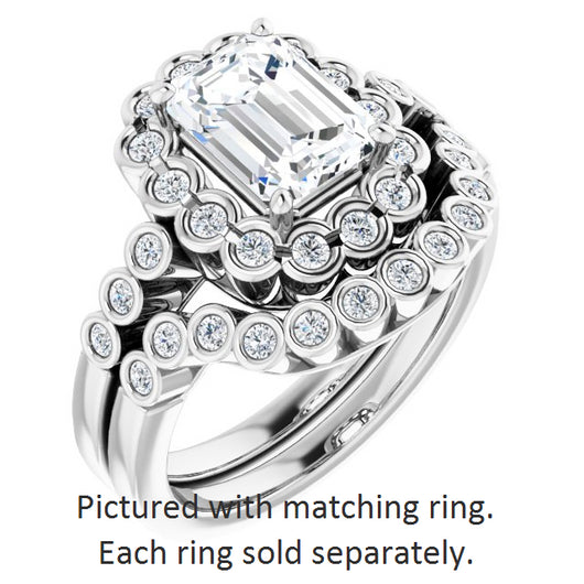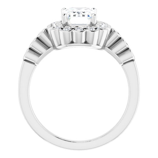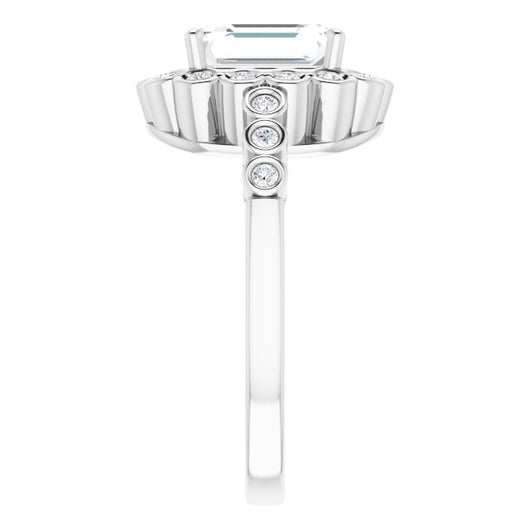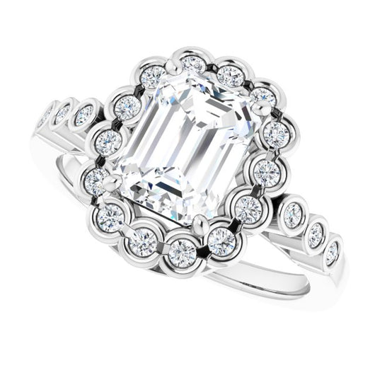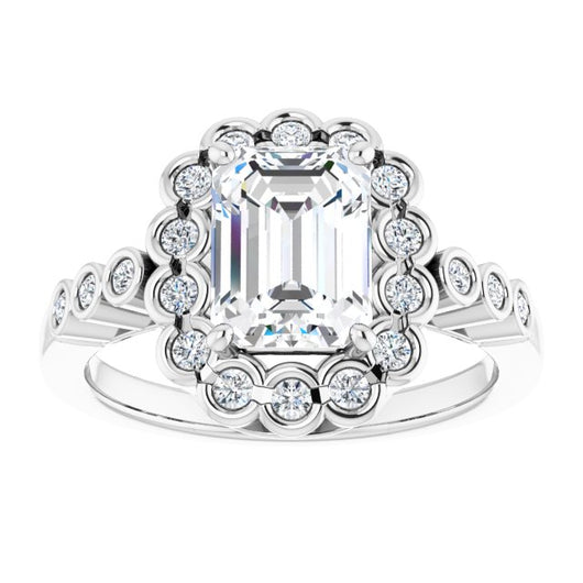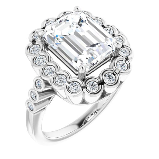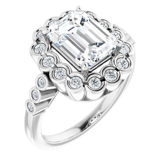 10K White Gold Customizable Emerald/Radiant Cut Design with Round-bezel Halo and Band Accents