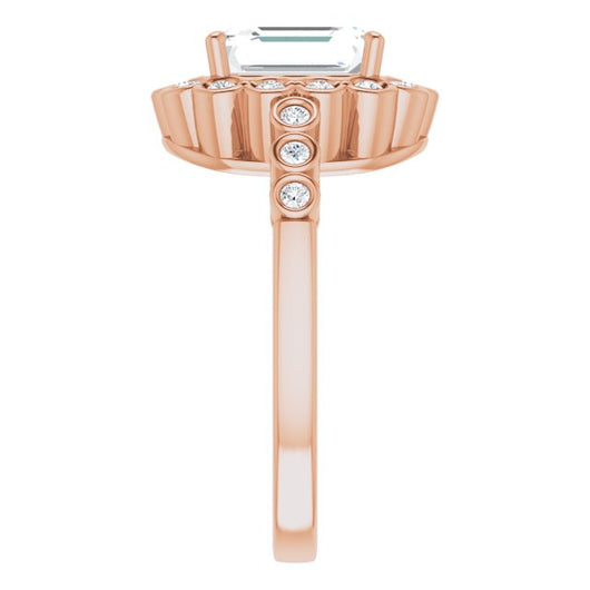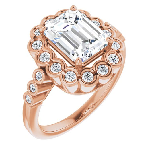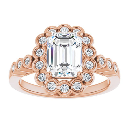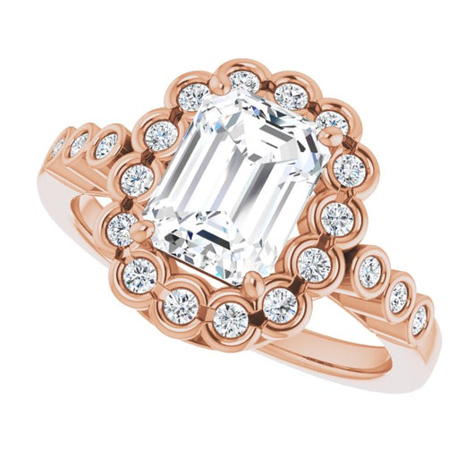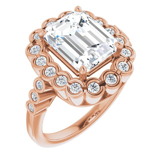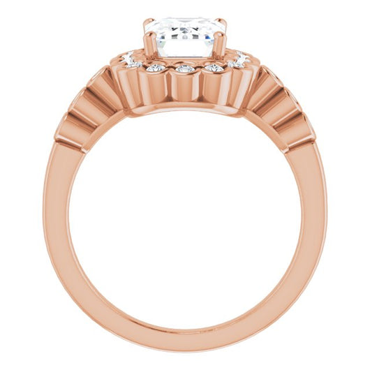 10K Rose Gold Customizable Emerald/Radiant Cut Design with Round-bezel Halo and Band Accents