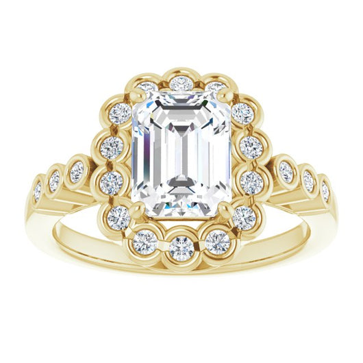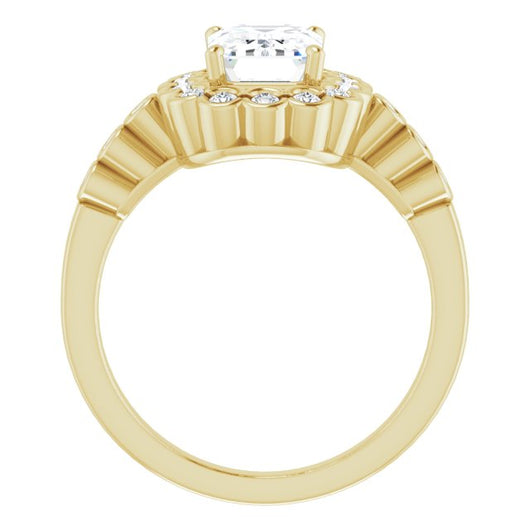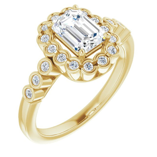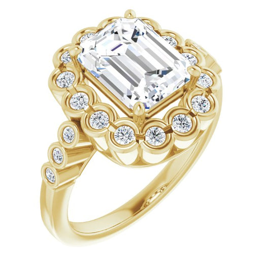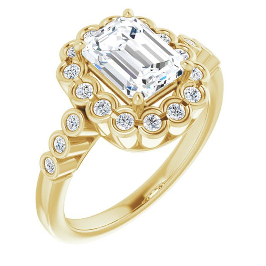 10K Yellow Gold Customizable Emerald/Radiant Cut Design with Round-bezel Halo and Band Accents