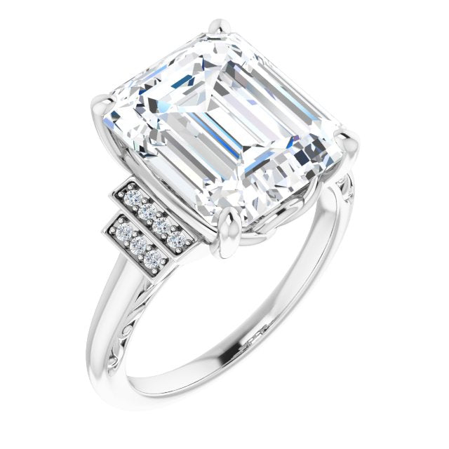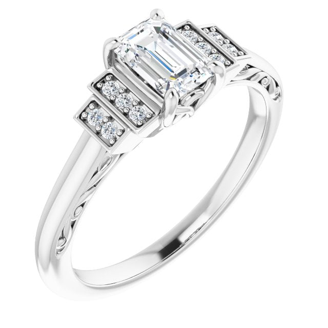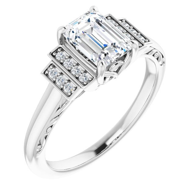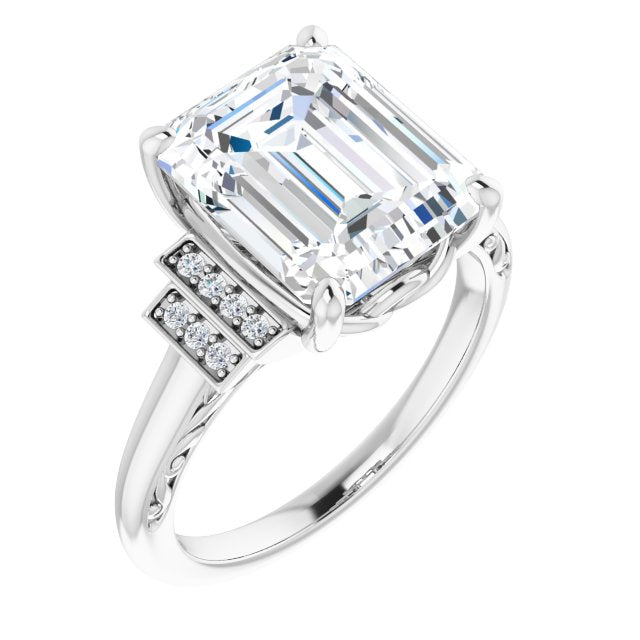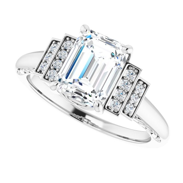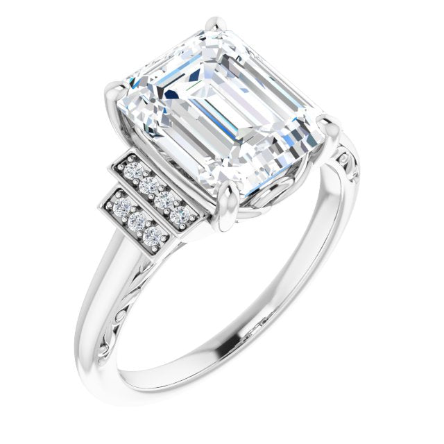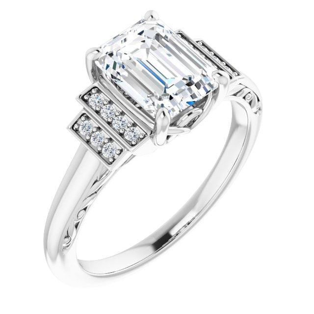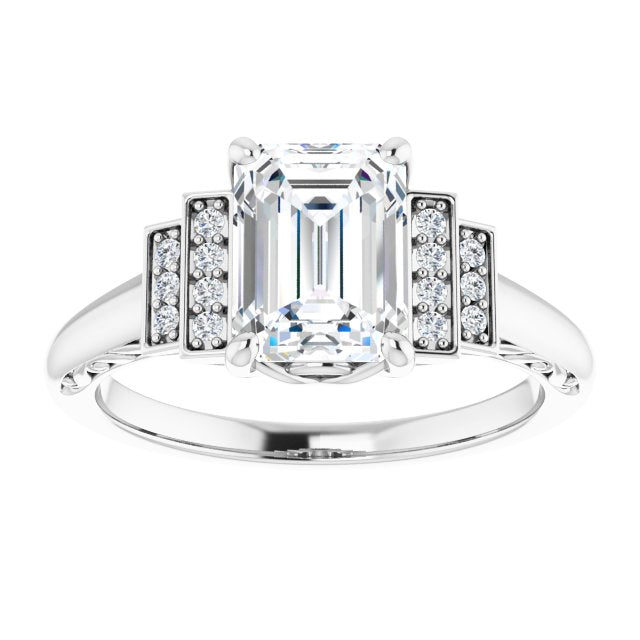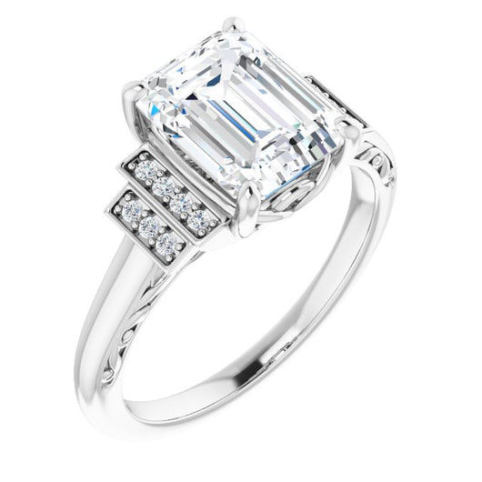 10K White Gold Customizable Engraved Design with Emerald/Radiant Cut Center and Perpendicular Band Accents