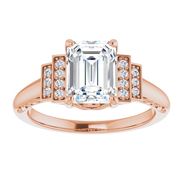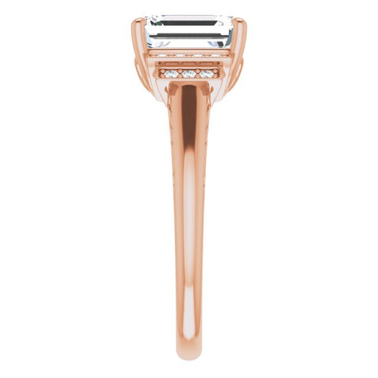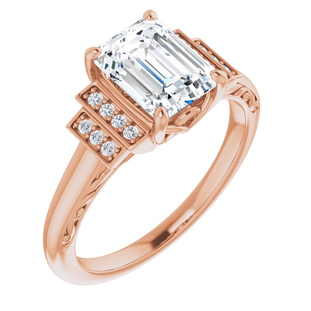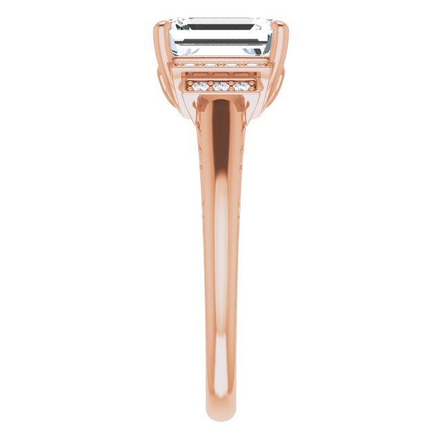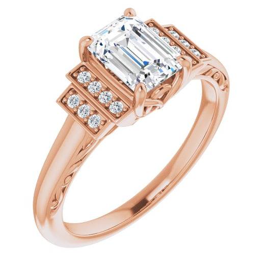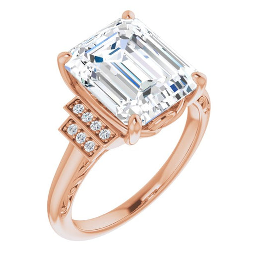 10K Rose Gold Customizable Engraved Design with Emerald/Radiant Cut Center and Perpendicular Band Accents