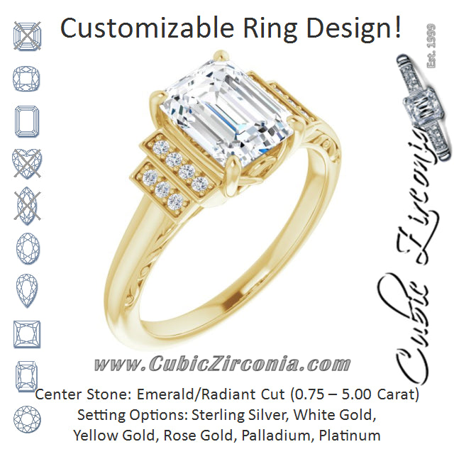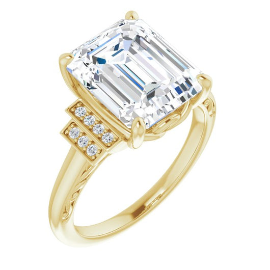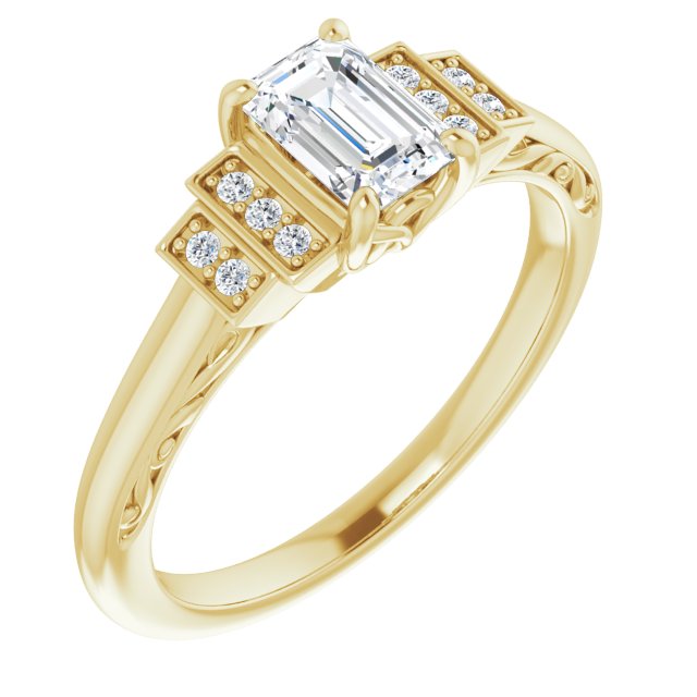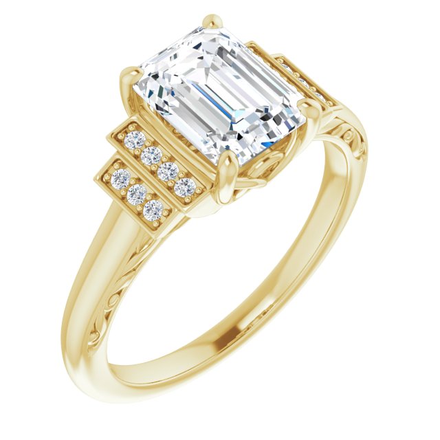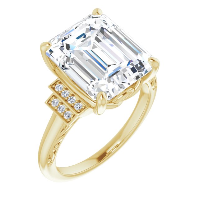 10K Yellow Gold Customizable Engraved Design with Emerald/Radiant Cut Center and Perpendicular Band Accents