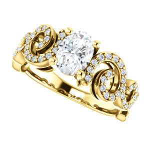 This split-band pave-style engagement ring with flowing lines and organic curves is constructed with one center stone of the shape and carat size you choose, plus sixty eight (count 'em, 68)* individual small side stones that loop, swoop, and swirl left to right and from the bottom up.