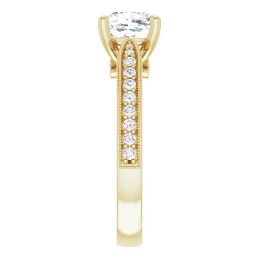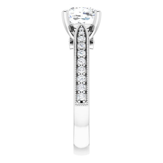 * Your ring’s total carat weight (TCW), band width, weight in grams, and/or number and size of accent, pavé, or halo stones will vary up or down depending on your choice of customizable center stone shape and size, precious metal type, and finger ring size via the drop-down options provided.