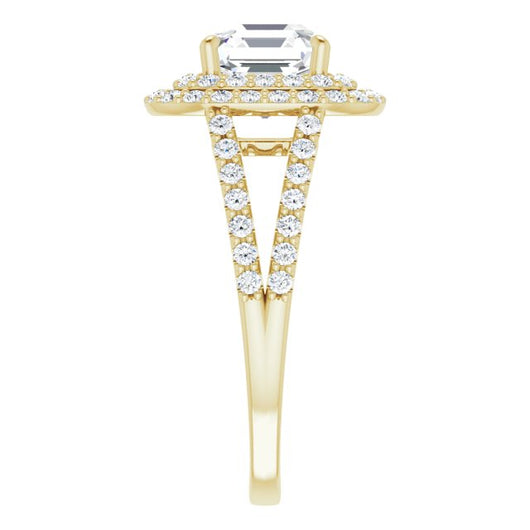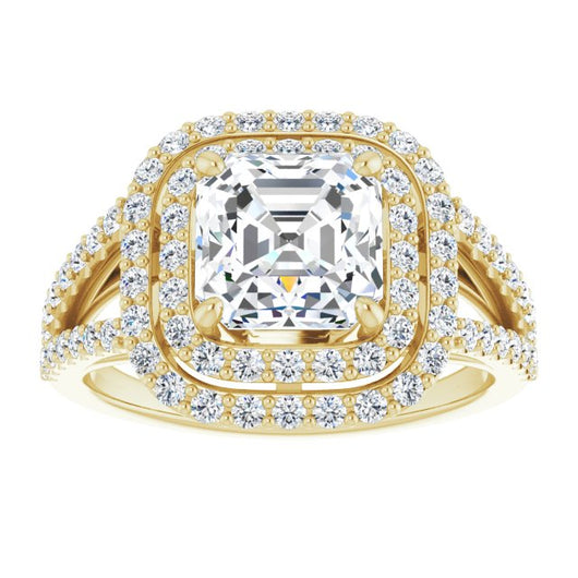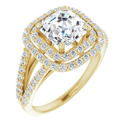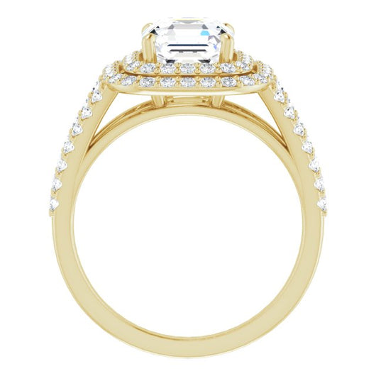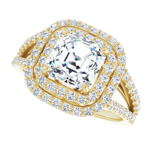 10K Yellow Gold Customizable Asscher Cut Design with Double Halo and Wide Split-Pavé Band