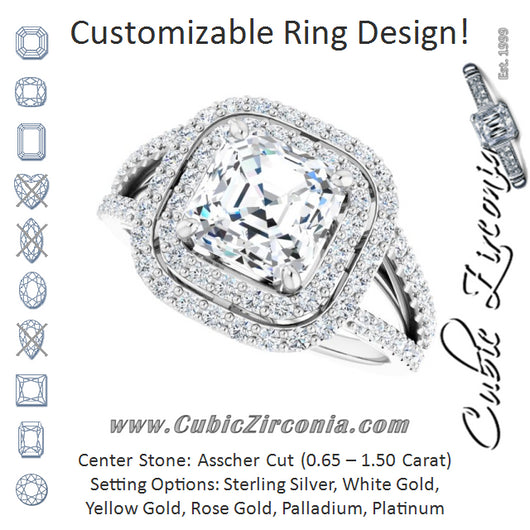 Cubic Zirconia Engagement Ring- The Carly Anne (Customizable Asscher Cut Design with Double Halo and Wide Split-Pavé Band)