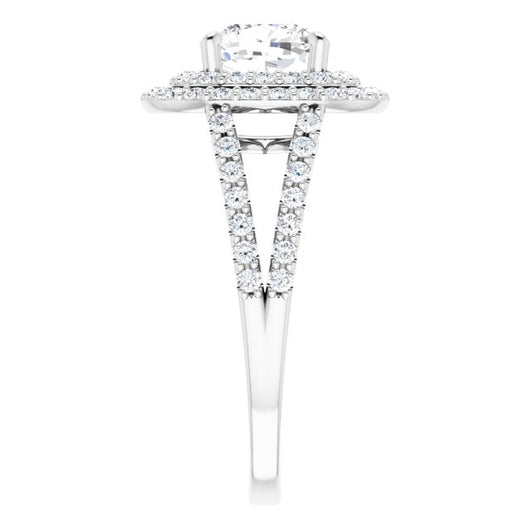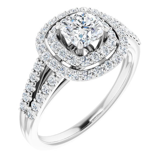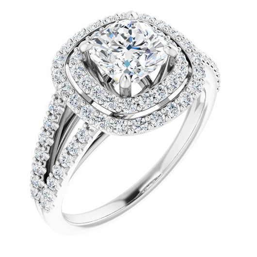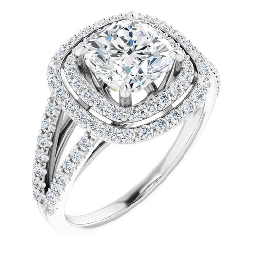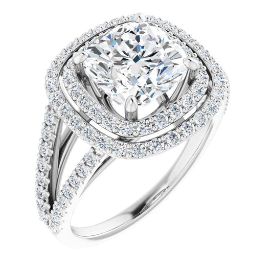 10K White Gold Customizable Cushion Cut Design with Double Halo and Wide Split-Pavé Band