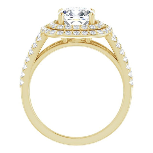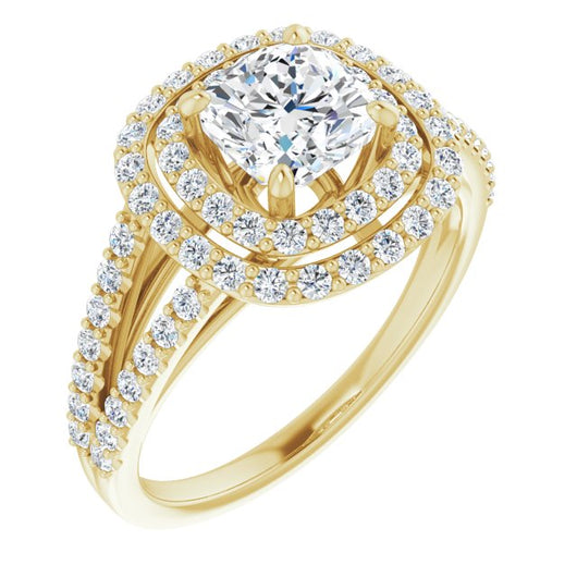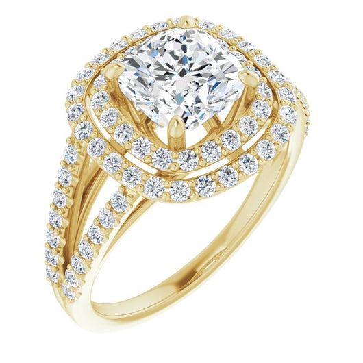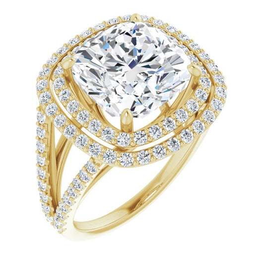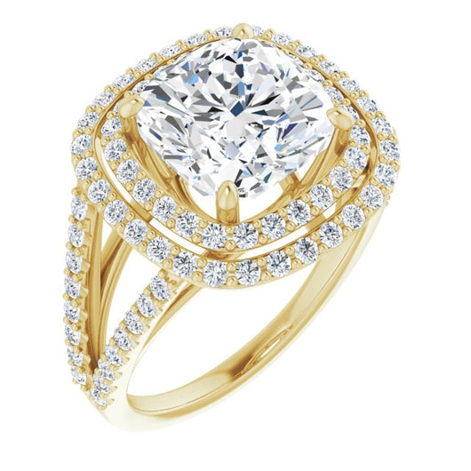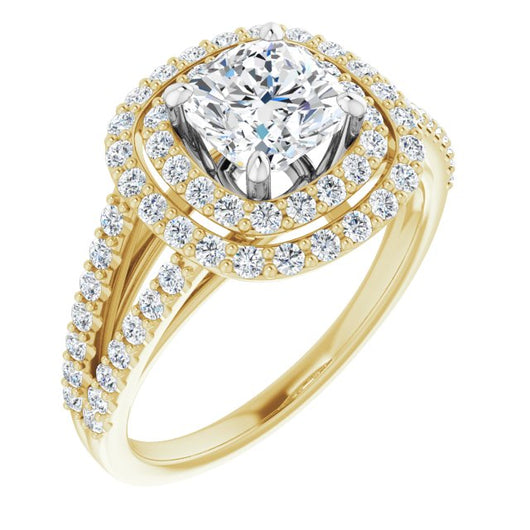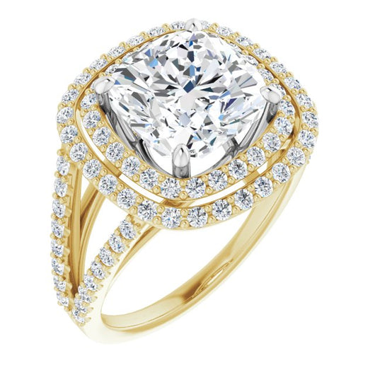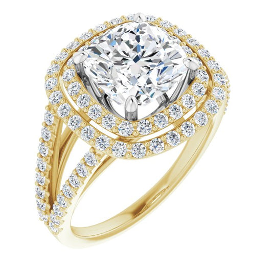 14K Yellow & White Gold Customizable Cushion Cut Design with Double Halo and Wide Split-Pavé Band