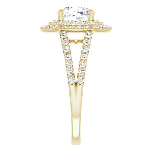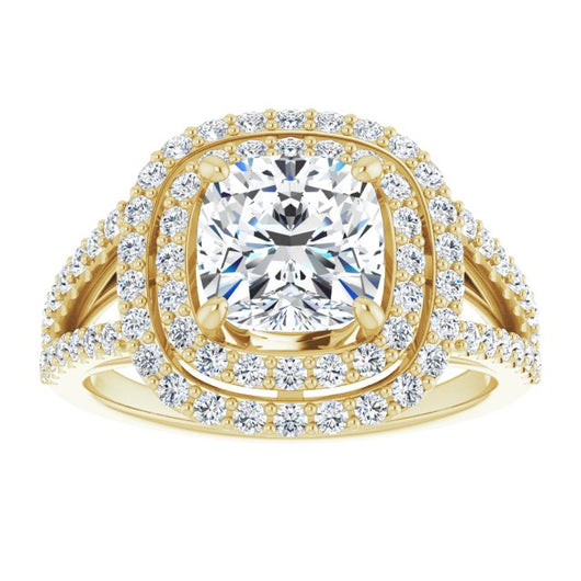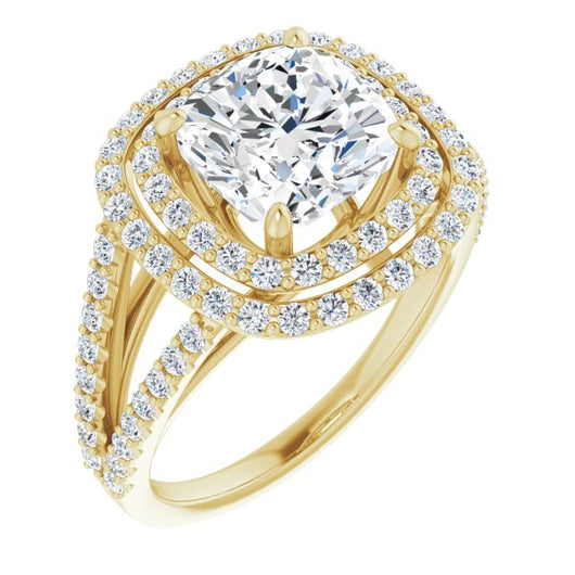 10K Yellow Gold Customizable Cushion Cut Design with Double Halo and Wide Split-Pavé Band