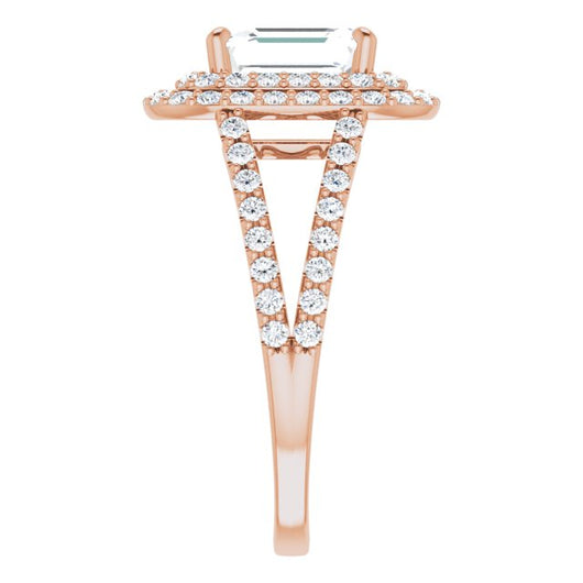 10K Rose Gold Customizable Emerald/Radiant Cut Design with Double Halo and Wide Split-Pavé Band