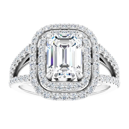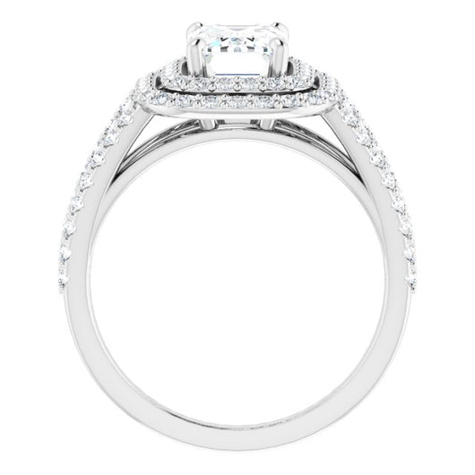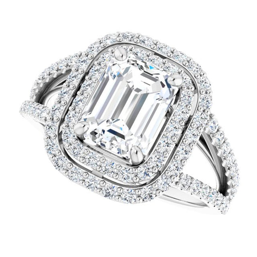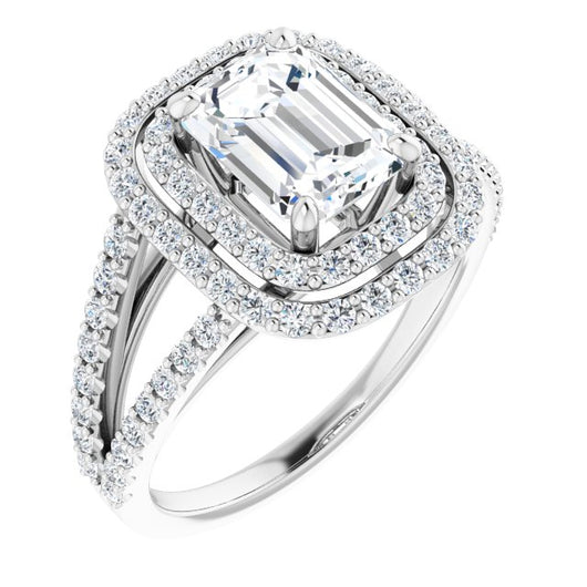 Platinum Customizable Emerald/Radiant Cut Design with Double Halo and Wide Split-Pavé Band