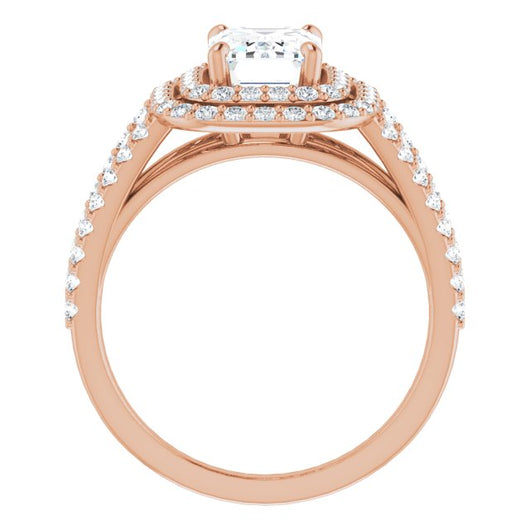 14K Rose Gold Customizable Emerald/Radiant Cut Design with Double Halo and Wide Split-Pavé Band