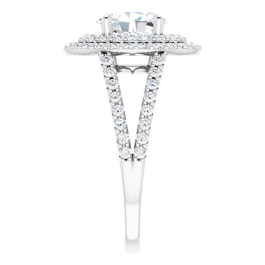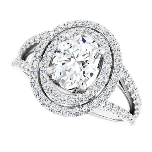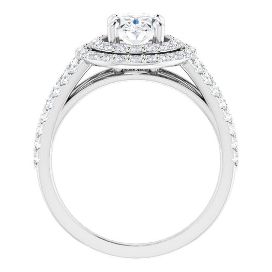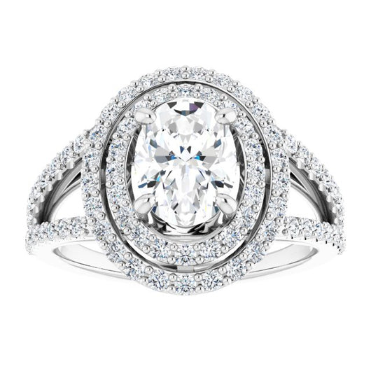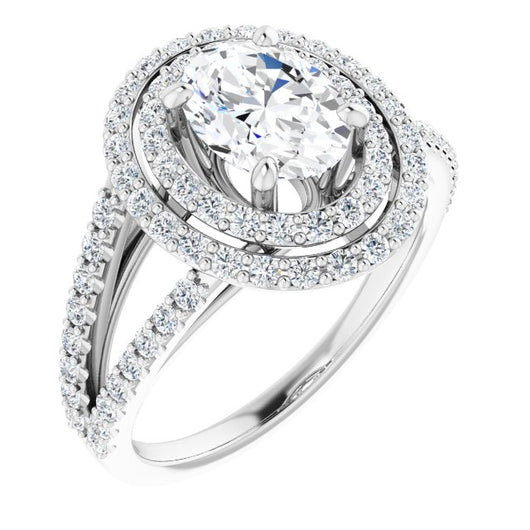 10K White Gold Customizable Oval Cut Design with Double Halo and Wide Split-Pavé Band
