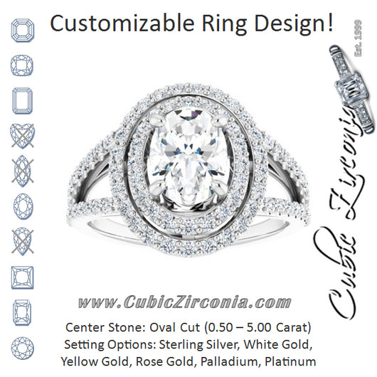 Cubic Zirconia Engagement Ring- The Carly Anne (Customizable Oval Cut Design with Double Halo and Wide Split-Pavé Band)