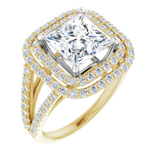 14K Yellow & White Gold Customizable Princess/Square Cut Design with Double Halo and Wide Split-Pavé Band