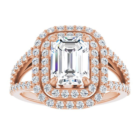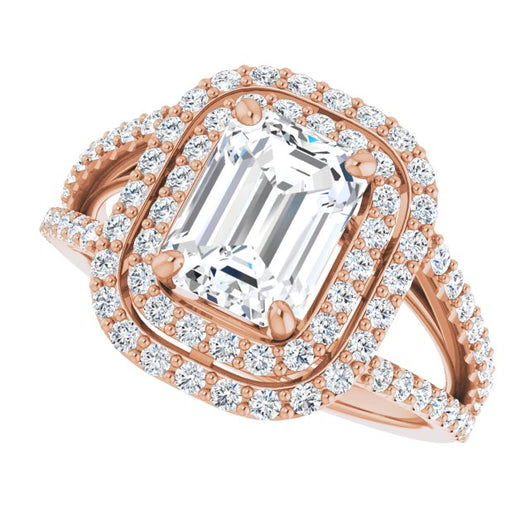 14K Rose Gold Customizable Emerald/Radiant Cut Design with Double Halo and Wide Split-Pavé Band