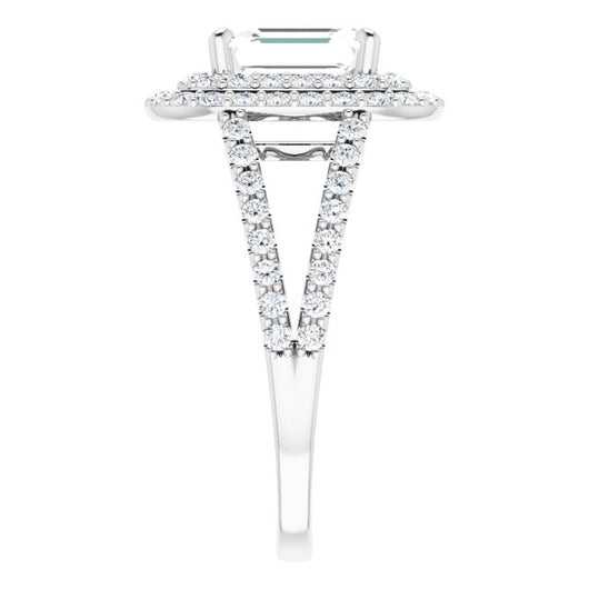 Platinum Customizable Emerald/Radiant Cut Design with Double Halo and Wide Split-Pavé Band