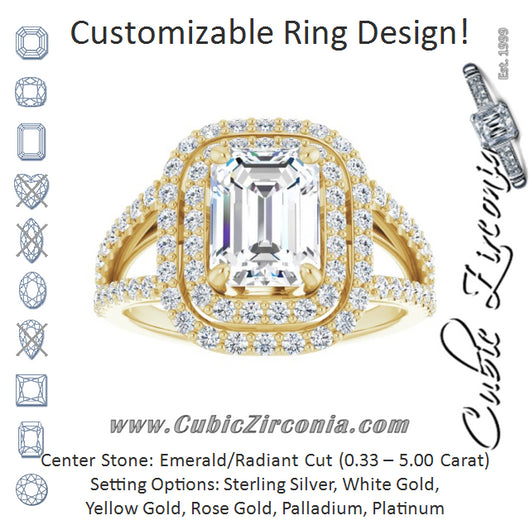 14K Yellow & White Gold Customizable Emerald/Radiant Cut Design with Double Halo and Wide Split-Pavé Band