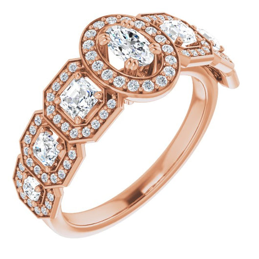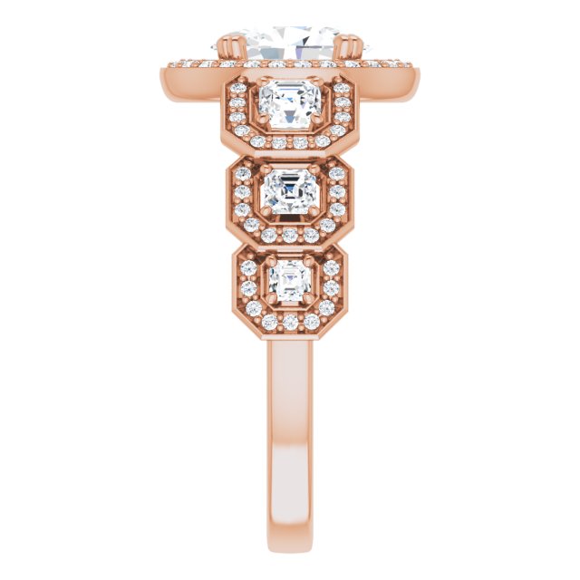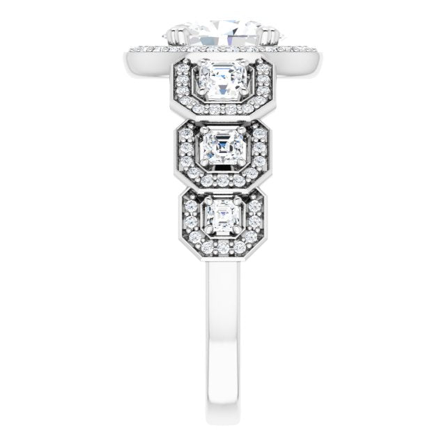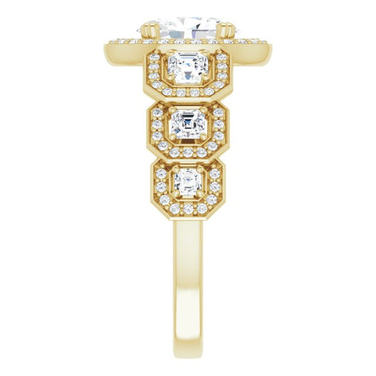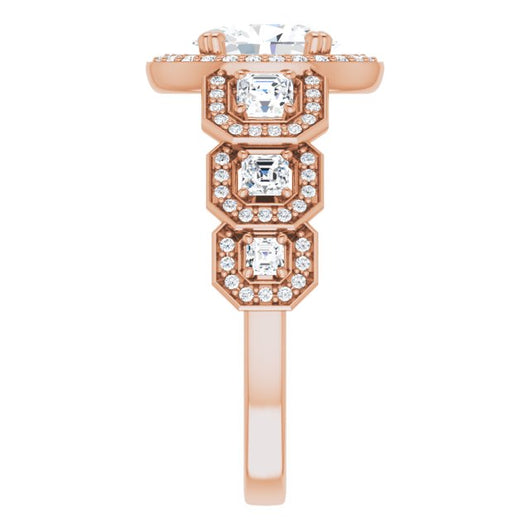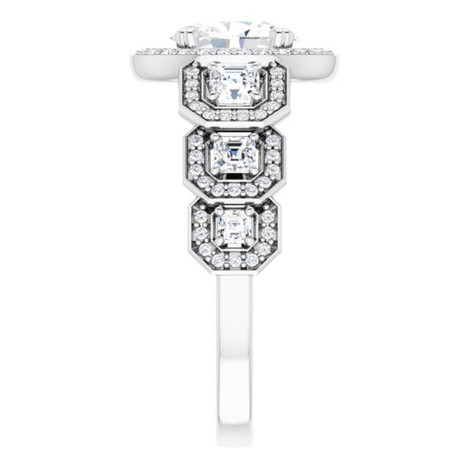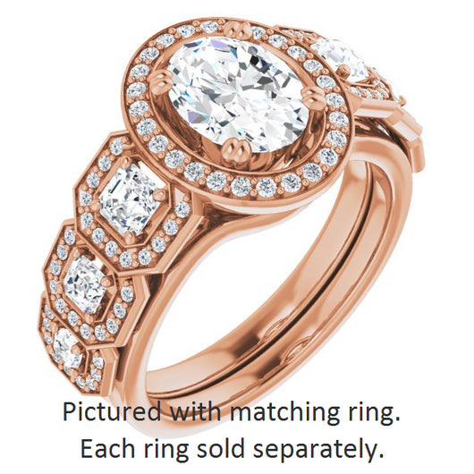* Your ring’s total carat weight (TCW), band width, weight in grams, and/or number and size of accent, pavé, or halo stones will vary up or down depending on your choice of customizable center stone shape and size, precious metal type, and finger ring size via the drop-down options provided.